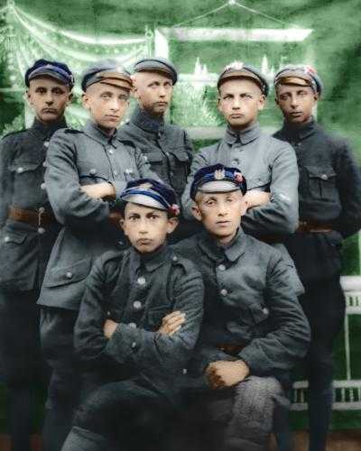 Na zdjęciu: Wieluńscy gimnazjaliści w częstochowskich koszarach, od lewej: Tadeusz Weber, Jan Godorowski, Oskar Focht, Kik, Henryk Świerczewski; siedzą: Zieliński i Rosental, 24 VII 1920 r.