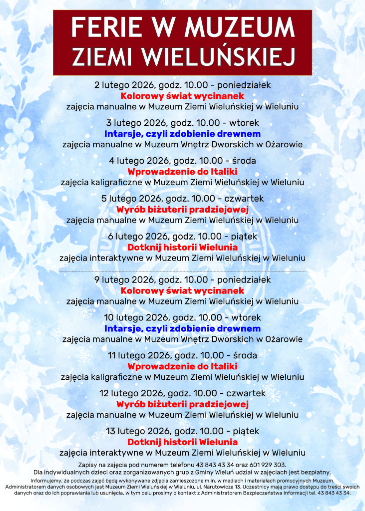 Zapraszamy do zapisów i uczestnictwa w darmowych zajęciach dla dzieci Gminy Wieluń w Muzeum Ziemi Wieluńskiej w ferie zimowe 2026. Zapisy na zajęcia pod numerem telefonu 43 843 43 34 oraz 601 929 303.