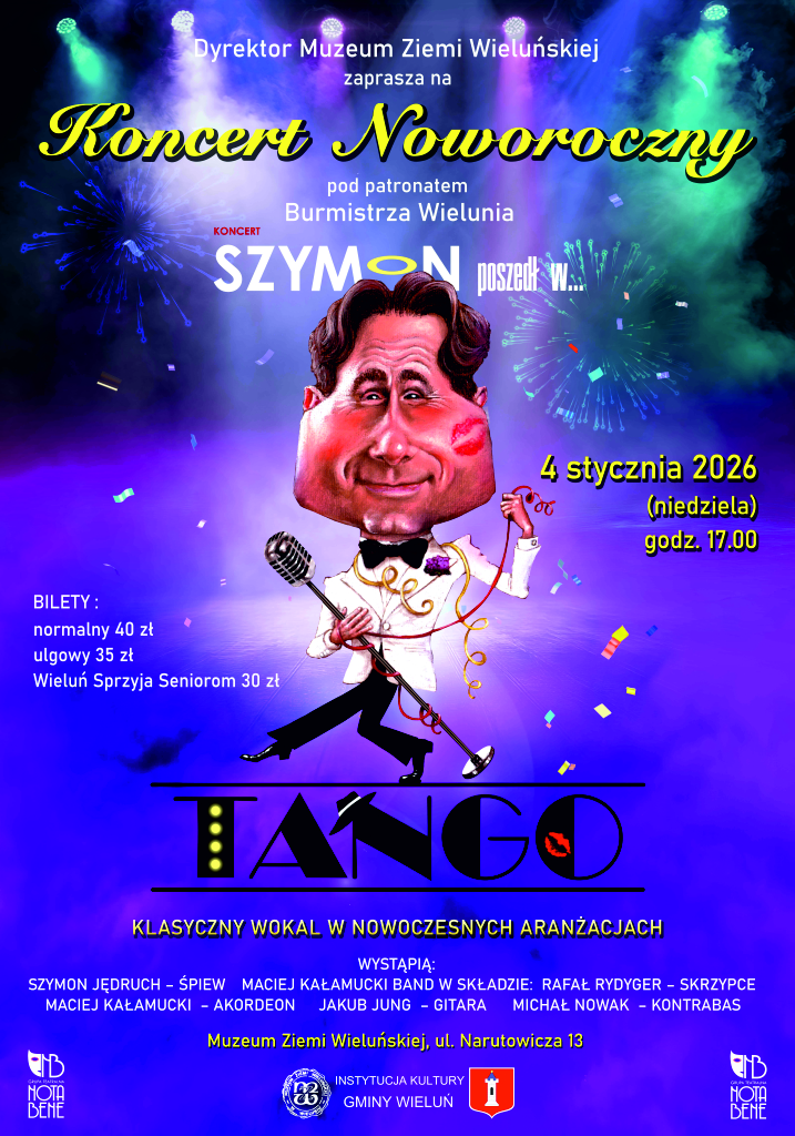 Muzeum Ziemi Wieluńskiej zaprasza 4 stycznia 2026 r. o godz. 17.00 na koncert noworoczny w wykonaniu Stowarzyszenia Grupa Teatralna Nota Bene. Koncert, lub jak kto woli – Stand Up Muzyczny “Szymon poszedł w tango” – wieczór pełen zmysłowego, kunsztownego i pełnego pasji tanga. Tanga, które nikogo nie pozostawia obojętnym, porywającego i… wyśpiewanego z głębi męskiego serca. Poczuj magię. Daj się porwać muzyce i zmysłowej atmosferze. Zatańcz. Sam, z przyjaciółmi lub z kimś, kogo dopiero poznasz lub spędź niezapomniany wieczór słuchając tanga w interpretacji znakomitych artystów.