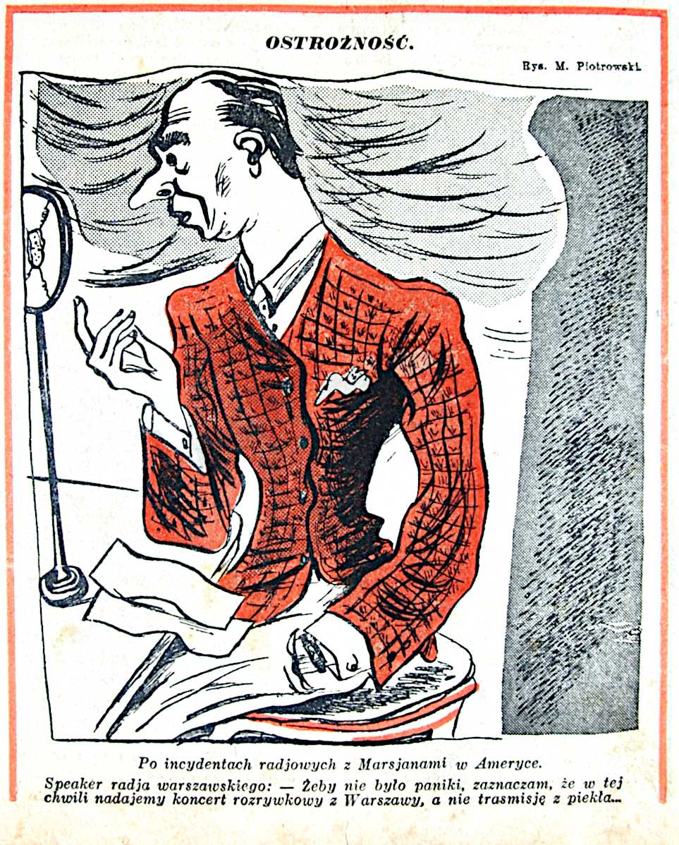 30 października 1938 r. amerykańska radiostacja CBS wyemitowała w eter ostrzeżenie o lądowaniu Marsjan w stanie New Jersey. Następująca po nim wstrząsająca relacja na żywo z postępów najeźdźców, wywołała wśród radiosłuchaczy wybuch masowej paniki. Panika okazała się całkowicie nieuzasadniona, ponieważ najazd Marsjan był jedynie swobodną adaptacją książki “Wojna światów” ojca fantastyki naukowej, brytyjskiego pisarza H. G. Wellsa. Zaś za przygotowaniem i emisją słuchowiska radiowego stał znakomity amerykański reżyser i aktor Orson Welles. Jak świadczy artykuł i karykatura, sprawa odbiła się w świecie znacznym echem.